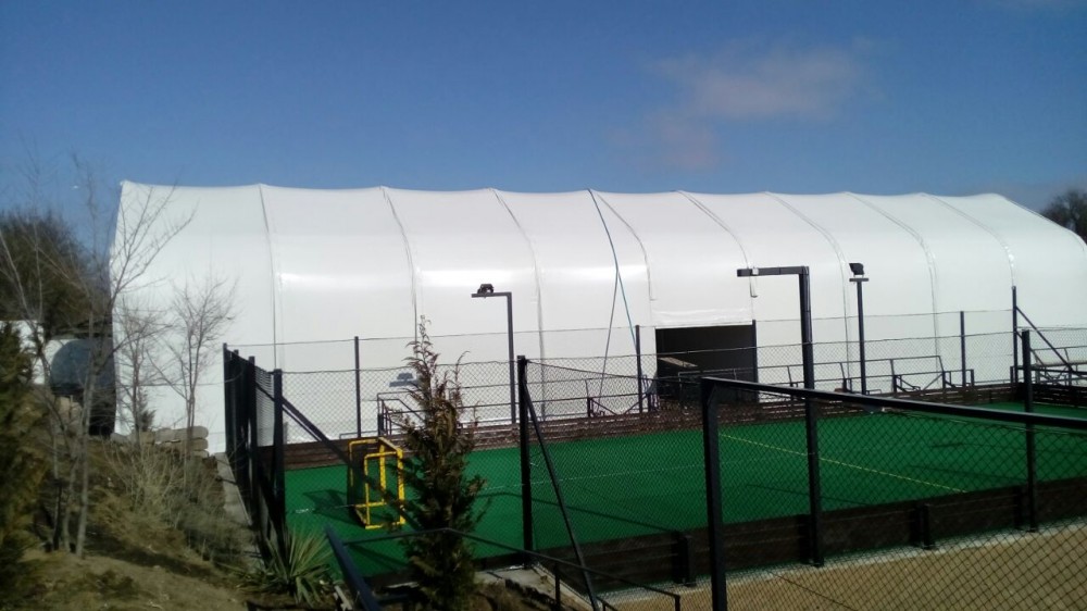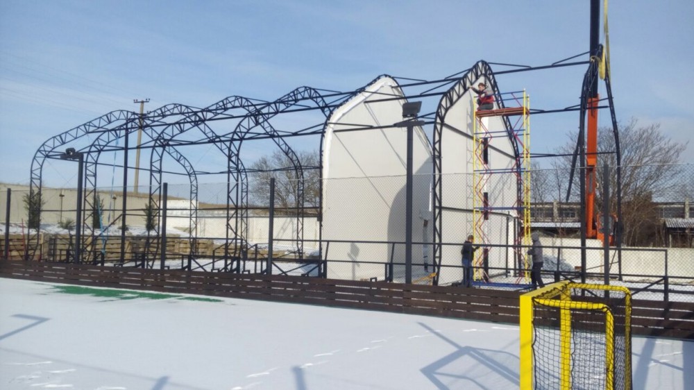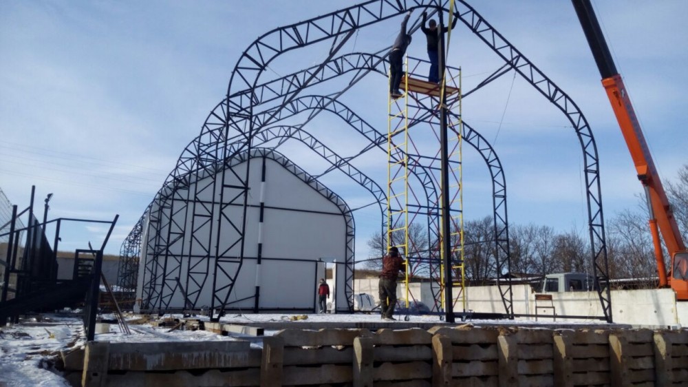 Близятся к концу монтажные работы в г. Керчь (Крым) ангара для танцев и спортивных мероприятий. В ангаре предусмотрен общий тамбур и два раздельных зала. Размер быстровозводимого здания Д35хШ10хВ8м. Цвет покрытия белый, цвет металлокаркаса - черный, как выразился Заказчик: "Современный шик"!